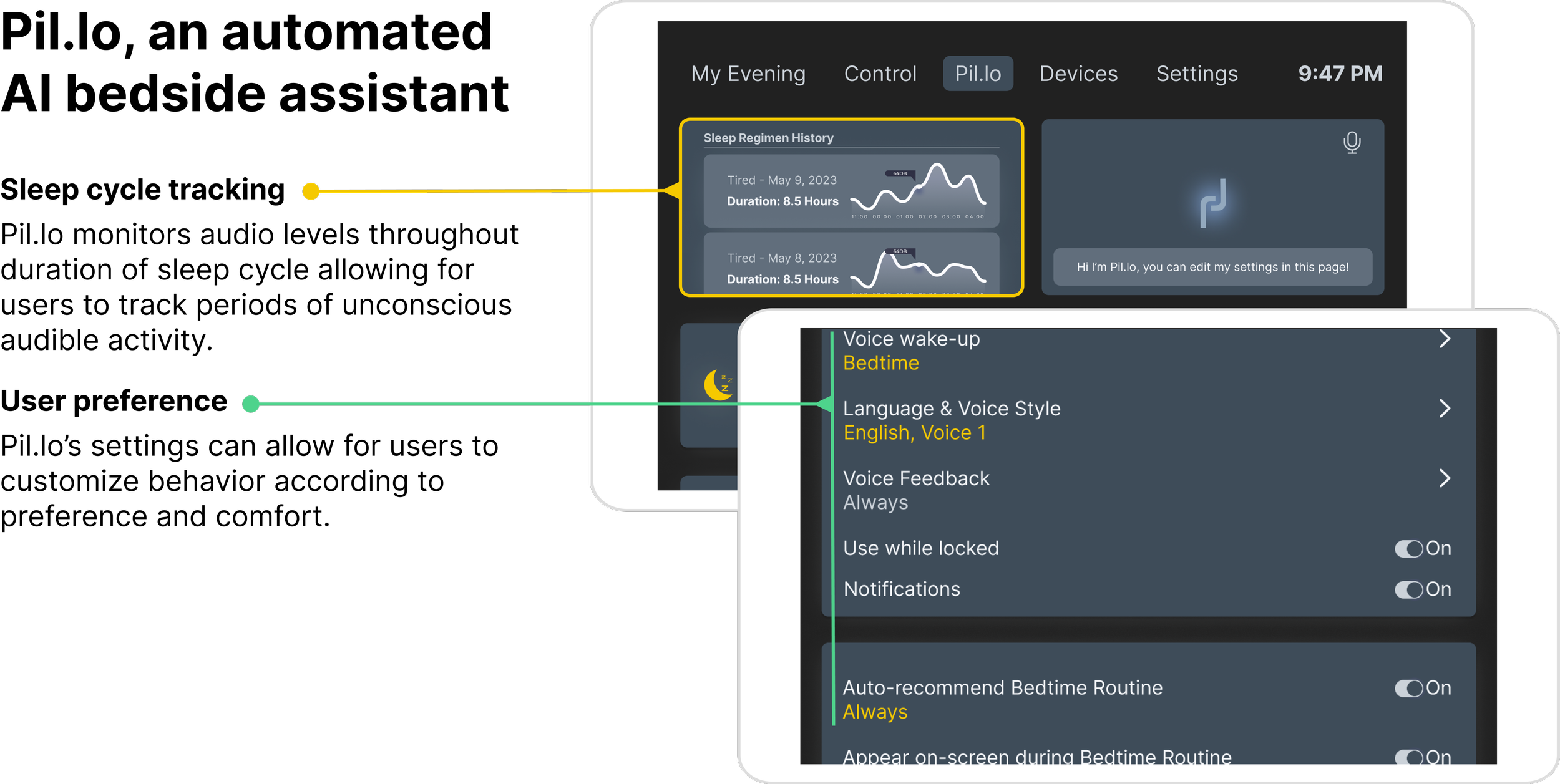 Pil.lo is an AI Assistant committed to providing a better sleep environment utilizing SMART home devices based on their level of fatigue.